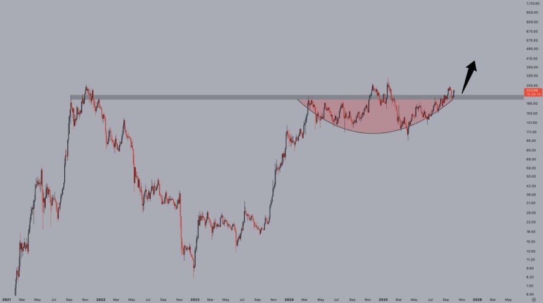 In a recent update, analysts revealed that the Solana price prediction to hit $500 may only be the beginning of a major rally. Long-term investor Jelle noted on X (formerly Twitter) that after 1.5 years of consolidation, the Solana price is gaining momentum. He further says that the Solana price looks primed for a big move, calling it a “hated rally” that could surprise many.