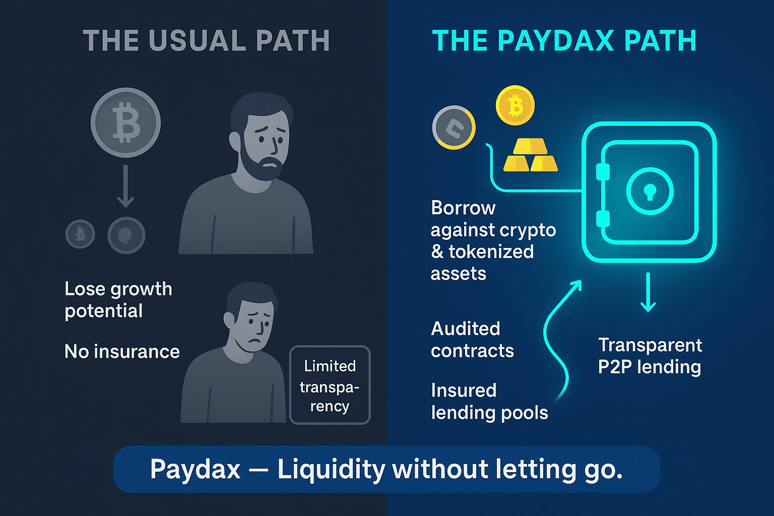 Paydax provides a smarter path. Instead of pushing investors to sell, it lets them borrow against their crypto or tokenized RWAs, such as gold and collectibles. With an audited contract, insured lending pools, and transparent peer-to-peer lending, it delivers both liquidity and security in a way DeFi has long promised but rarely achieved.